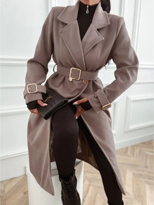 Letisztult, nőies szabásvonal, széles övvel, csatokkal.