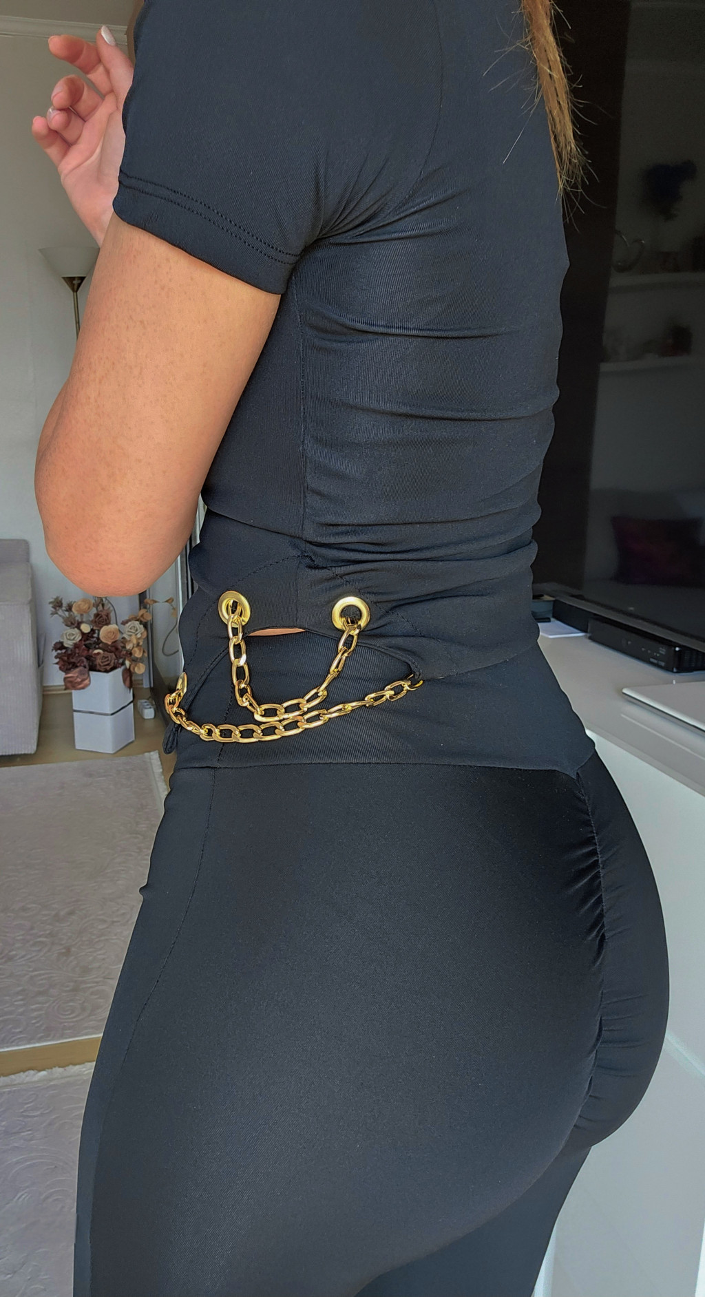 Elől fűzős, alakformáló nadrág, rövid ujjú felső oldalán lánc díszítéssel.Kényelmes, testhezálló fazon.