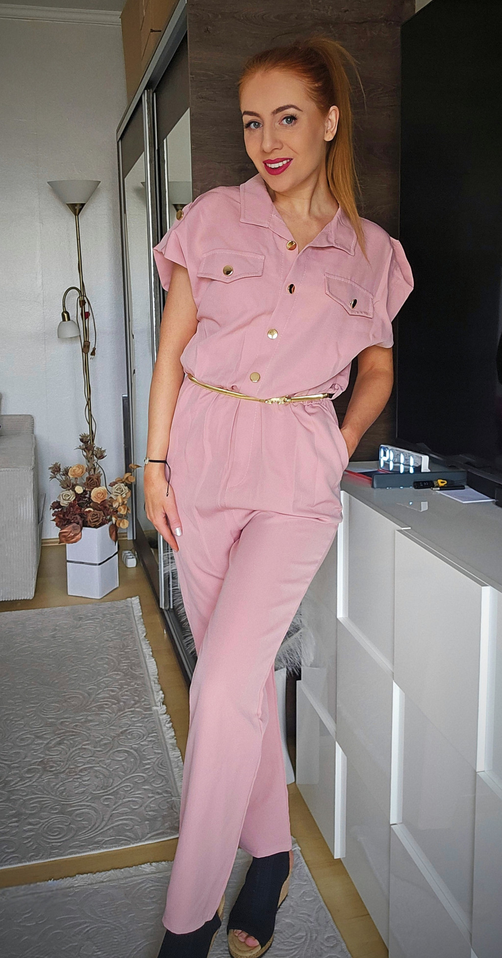 Olasz púderrózsaszín overál arany övvel