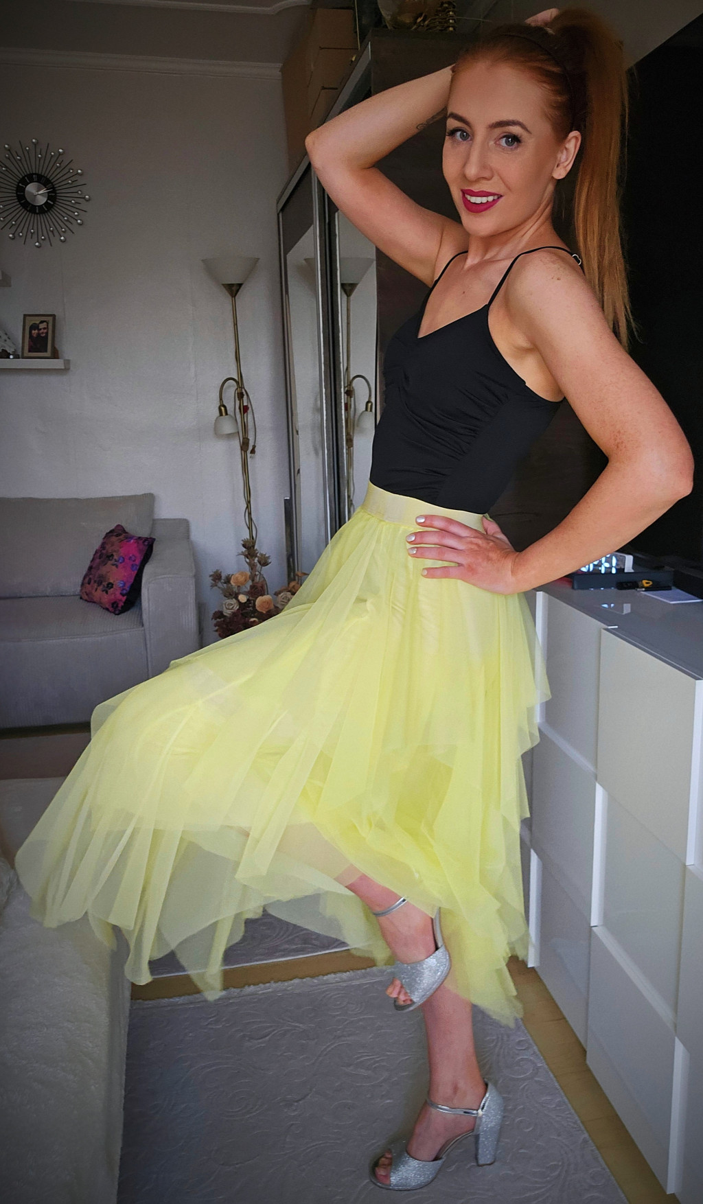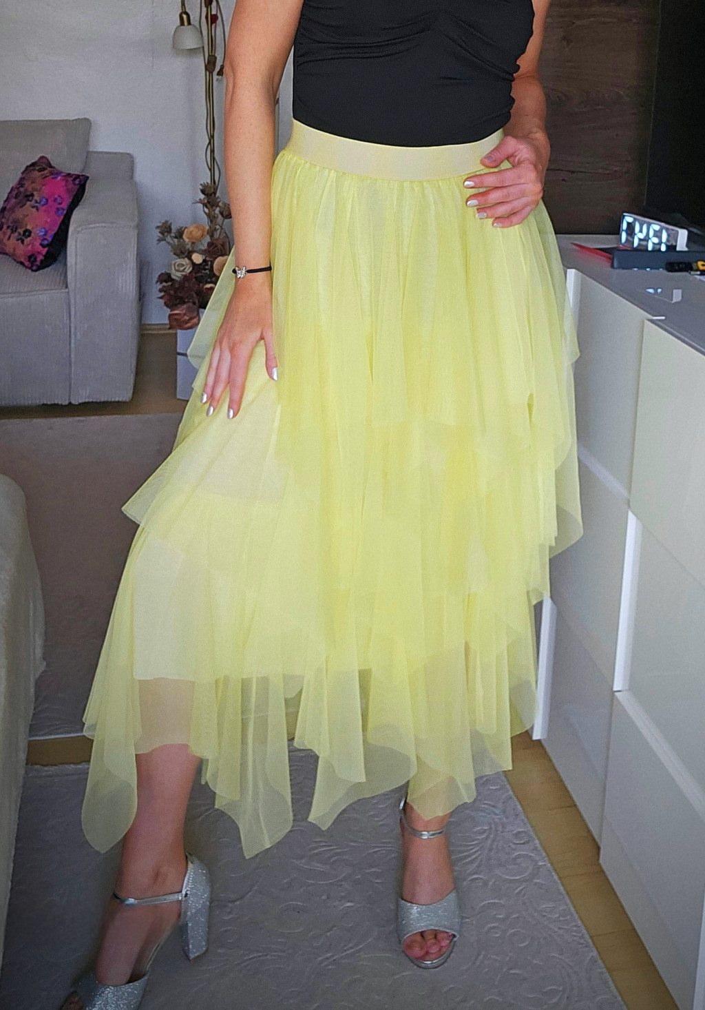 Látványos, réteges kialakítású tüll szoknya könnyű anyagból, gumis derékrésszel.