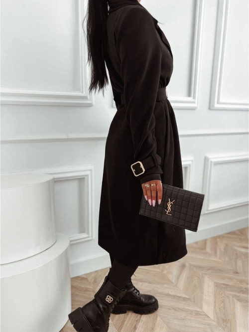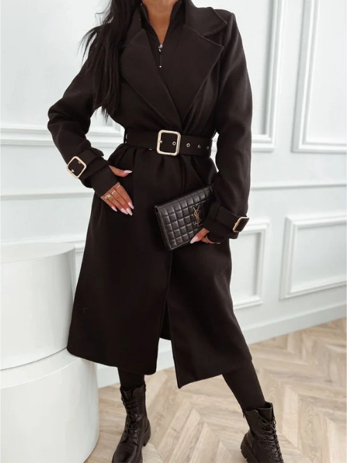 Letisztult, nőies szabásvonal, széles övvel, csatokkal.
